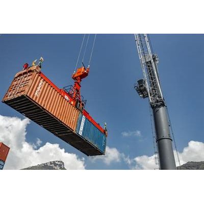 Telescopic spreader for mobile harbour crane. This spreader is standard equipped with a suspension tower, centre of gravity adjustment and 6 hydraulically controlled corner flippers. Various options such as 45 foot possibility, twin-lift, vertical adjustment ( allowing you to take containers from an inclined ship), various position stops and a far-reaching diagnostic system are among the possibilities. There is also a lightweight version of this spreader available for less heavily loaded applications.
