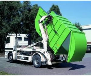 - Integrated lift-tipping-device for bins with pivot take-up (lifts the waste bin and tilts the contents into the compactor)