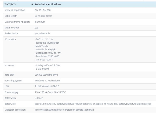 The TINY|PC.3 is light and compact and at the same time extremely robust and of high quality designed to optimally handle every use in and around the building. With a total weight of less than 20 kg* and a telescopic push handle, the TINY|PC.3 can be easily transported to any location. The small footprint enables the device to be used even in very tight spaces and can be stowed away to save space thanks to the fold-away monitor. The system can be used from a pipe diameter of Ø 30 mm and is compatible with the cameras MINI, VERTICA 30, VERTICA 40 and SR50, among others.