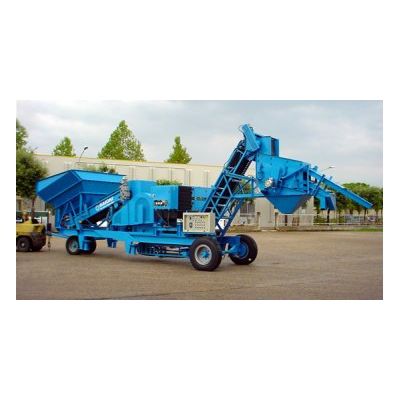 Mobile secondary units, mod. CANGURO GMS, are best-able for the utilization of small quarries and for the crushing and screening of both granite and limestone materials. Four final selected sizes may be obtained, plus a fifth waste size. These units are mainly made up of a crushing machine, a bucket conveyor and a vibrating screen for material selection. All the machines are mounted on a single mobile frame complete with everything necessary for the normal road slow towing (axles with tyres of suitable quantity and section, laminated spring-suspensions, towing rudder, braking system, etc.) and adjustable stabilizers which allow an easy and quick placement on site without any particular concrete foundation. All machines are driven by a Diesel engine.