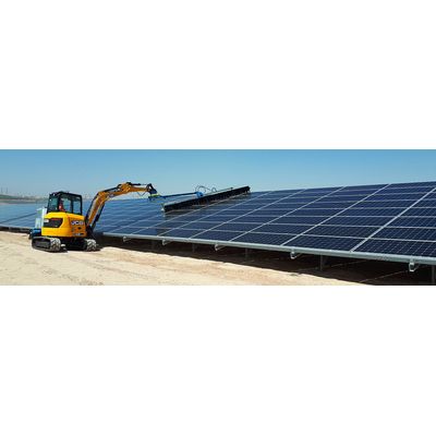 Particularly in desert regions, the rows of photovoltaic systems are situated very close together, or crossbars in tracker systems prevent unhindered passage, which presents a problem when it comes to solar cleaning. SunBrush Mobile Rapid solar cleaning is the ideal solution for exactly this purpose. This is because the compact solar cleaning system is attached to a mini-excavator. It is operated with a joystick so that the brush can be moved flexibly in any direction.