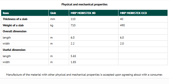 MRP MOBISTEK-80 composite slabs are best-performing on water-logged soils, swamps of I–II types, exhibit positive buoyancy, can sustain machinery weighing up to 80 tonnes; MRP MOBISTEK-ECO slabs are best-performing if used as substitution for ferro-concrete slabs on hard bases, the slabs can sustain machinery weighing up to 120 tonnes.