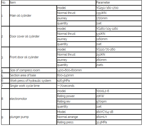 Main technical parameter of NKY81-1350metal hydraulic baler