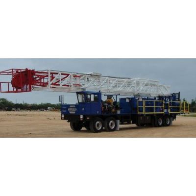Service Depth: 14,500 ft (2-1/2` tubing). Workover Depth: 10,500 ft (2-7/8` DP). Max. static hook load: 205,000 lbs (6 lines). Clear Height, Mast: 96` Rated Horsepower, Engine: 350 HP/2,200 rpm. Height, Tubing Board to ground: 55`-10`. Height, Rod Board to ground: 78`-6`. Carrier: 4 axle - two steer and two drive axles. Diameter, Wireline: 1`. Road Traveling dimensions: 56`-5` long x 9`-4` wide x 13`-8` high. Carrier Dimensions (excluding mast): 38` long x 9`4` wide x 9`-8` high.