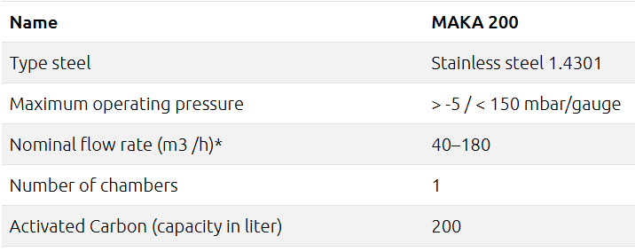 MAKA: Flexible exchange filters for biogenic gas plants. Learn more about the market-leading, integrated activated carbon filter solutions from our MAKA series. These mobile stainless steel exchange filters are suitable for the removal of hydrogen sulfide (H2S), VOCs, and siloxanes. As part of our activated carbon replacement service, we quickly and safely replace the entire filter with a new exchange filter, filled with fresh activated carbon, once the activated carbon is saturated.