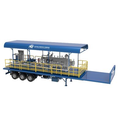Current model of trailer-mounted packages is designed to accommodate conventional test separator, equipment of emergency shutdown system, choke manifold and data header. Current mobile separator with ESD and choke manifold allow fast mobility, safe and efficient well testing. As show in 3D modeling, current model requires lighter trailer base as HC considered light frame for test separator. Trailer can be longer or shorter based on the client’s operational requirements. Surface well test trailer package (SWT Package) or trailer mounted surface well test system is a special system of well test equipment designed to separate well fluids into two/three/four phases, then accurately measure behavior of each phase after separations.