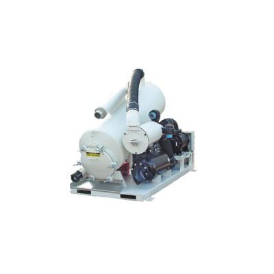 The vac system is driven by a 44 HP (33 kw) diesel engine and provides 1,000 CFM @ 6″ to 8″ of mercury. A 220-gallon tank collects all waste and debris. A side-mounted port allows for the water to be drawn off with the included solid handling pump. The standard mounting package includes a skid with forklift slots and lifting lugs.