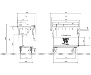 The Weber waste bin 660 litre is made of polyethylene (HDPE) in a compact injection molding process in accordance with EN 840-2. This wheelie bin has a lid with an easy-to-open insert lid (lid in lid) making it particularly user-friendly. Like all of our waste bins, this model is resistant to UV, frost, heat and chemicals as well.- All metal parts are corrosion-resistant thanks to galvanic zinc plating