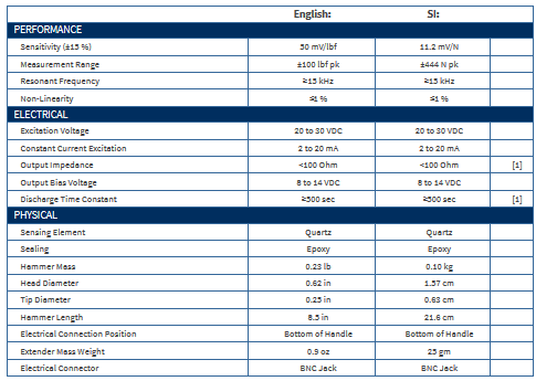 Modally Tuned Impulse Hammer w/force sensor and tips, 0 to 100 lbf, 50 mV/lbf (11.2 mV/N).
