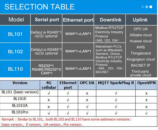 Modbus Gateway BL101 is an industrial IoT gateway that converts Modbus RTU and Modbus TCP into Modbus TCP, OPC UA, MQTT, Huawei Cloud IoT, AWS Cloud, Aliyun, KPIIOT Cloud and other protocols.