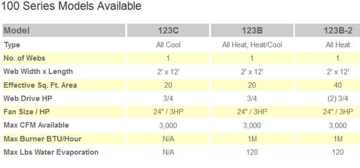 100 Series conveyor systems are easily installed.They are built, assembled, tested, then shipped for reduced installation costs and quick start-up. Additional Features - Recycles heat from cool section in dryer/cooler models. Have an adjustable product depth and variable airflow for proper airflow selection. Carries product to eliminate mechanical damage, plus the conveyor is carried on rollers for higher load capacity.