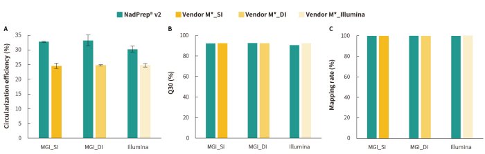 The NadPrep Universal Circularization Kit v2 is designed for preparation of a single-stranded circular DNA (ssCirDNA) library for the MGI platform based on DNBSEQTM technology. The circularization module inside is compatible with the circularization of libraries with single index (SI) adapters and dual index (DI) adapters on MGI platform, and NadPrep Universal Stubby Adapters (UDI), and is suitable for the circularization of libraries converted by the MGIEasy Universal Library Conversion Kit (App-A), with the preparation of single-stranded circular libraries effectively streamlined.