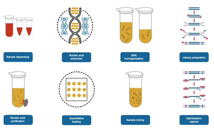 - The dynamic deck with 30 built-in standard plate positions supports free configuration of high-throughput workstations and provides seamless integration of cooling and heating temperature control modules, heating and oscillating modules, thermal cycler, and a full range of Nanodigmbio library preparation and liquid phase hybridization capture products to handle complete high-throughput sequencing workflows.