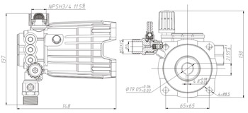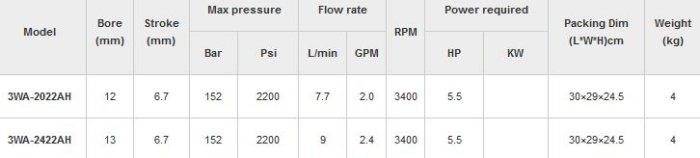Forged brass manifold. Anodized die-cast pump housing. Strengthened aluminium wobble plate. Dual thrust bearing. Hardened solid stainless steel plunger.German U-packing. Reinforced valve cage, stainless steel pop-off valve Thermal relief valve. To protect the pump from over-heat.Integrated unloader, pressure adjustable. Fix rate detergent injector.Inlet: 3/4NH-11.5 or 3/4BSPP-14.Outlet:M22 thread on