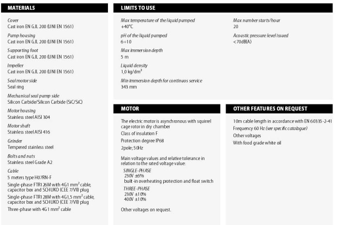 These series of grinder pumps are particularly used in civil and industrial sewage plants. They have been designed to pump the liquid at high head with very low capacity. The cutter unit, in a special hard stainless steel, cuts into small pieces threadlike materials contained in the liquids. As the risk of clogging is avoided small diameter pipes are used. These pumps can be used to lift the sewage of blocks of flats and villas, small isolated areas far from the sewer systems; the sewage of hotels and campsites, in the food and paper industry and in those particular situations where the installation is often expensive by using a gravity system.
