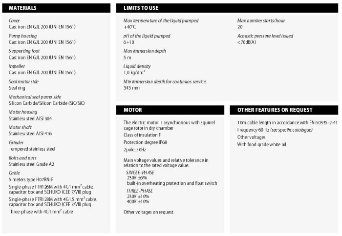 These series of grinder pumps are particularly used in civil and industrial sewage plants. They have been designed to pump the liquid at high head with very low capacity. The cutter unit, in a special hard stainless steel, cuts into small pieces threadlike materials contained in the liquids. As the risk of clogging is avoided small diameter pipes are used. These pumps can be used to lift the sewage of blocks of flats and villas, small isolated areas far from the sewer systems; the sewage of hotels and campsites, in the food and paper industry and in those particular situations where the installation is often expensive by using a gravity system.