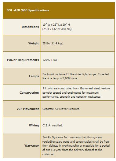 The Sol-Air 200, with its patented and proprietary Ultraviolet system, features dual processing chambers for larger commercial cleaning and the fire and flood restoration trade. For best results, this unit is designed to be used with a high-speed air blower (1500- 2500 cfm). Sol-Air systems decontaminate air, eliminating bacteria, viruses, molds and hundreds of unpleasant odors caused by fire, smoke, mildew, flood damage, chemical pollution, spills, sewage backup, black water, standing gray water, etc.