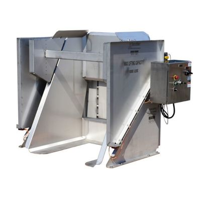 The newest addition to the Open Sanitary (OS) Family! This Bin Dumper “dumps” bins of product onto conveyors, hoppers, or belts making less work for Production, Maintenance and Sanitation. Features: Innovative Channelized® Stainless Steel Construction, Fully Self-Contained Unit, All Electric Unit (no hydraulics) with NEMA 4X Controls, Floor Level Entry Deck for Easy Access, Open access for sanitation and inspection, with minimal laminations, horizontal surfaces or closed corners, 1000lbs. Load Capacity, 135° of Rotation for Floor Load Model, ensures Complete Product Dump, Programmable Inclinometer for 150° Dump Applications, Adjustable Bin Stop Bar for Flexibility, Machined Stainless Steel Pivot Shaft with 2-piece 4" nylon flange bearings, Stainless Steel Safety Sides for Pinch Point Guard System