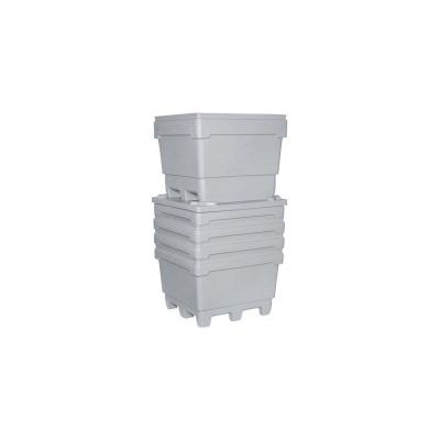 Footprint (L x W) - 48` x 44`. Available in heights from 33` to 56` high. Seamless, one piece construction. Molded extra strength with proprietary resin. Extra thick corners and base resists impact and wear. Reinforced top edge adds strength and resists splitting. Lighter weight and less cost than stainless steel and much easier to handle. Nestable/Stackable 2-high with optional lid.