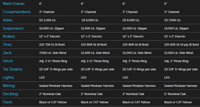 Capacity:8,000 Lbs.10,000, Lbs.12,000, Lbs.14,000, Lbs. Overall Width:98” / 102”, Optional 98” / 102”, Optional 98” / 102”, Optional98” / 102”, Optional. Deck Length: 14’ – 20’ , Flat 14’ – 20’, Flat 14’ – 20’, Flat 14’ – 20’ Flat