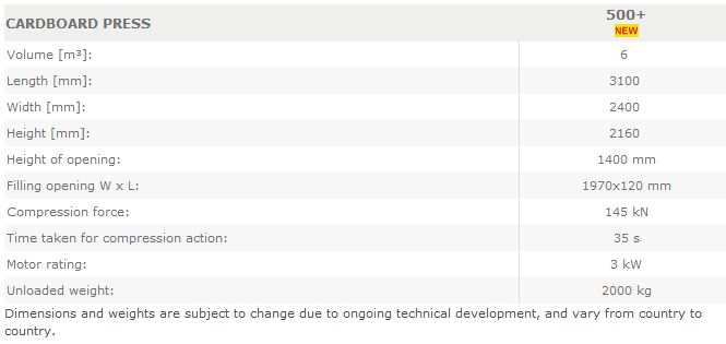 Compression 5:1: For The Cardboard press 500+ is the ideal machine for the collection of cardboard on public places as recycling collection points, supermarkets, petrol stations, etc.