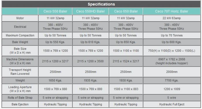 The Ceco 550, 550HD, 650 and 70T Horizontal Balers make up our large sized range producing bales from 550 to 650 Kgs. These machines will bale cardboard, plastic, paper, tyres, car bumpers, hard plastics such as computer monitors / cases, etc. and are suitable for very large producers, Council Yards, Recyclers, Shopping Centres, Factories, Etc. All four of these balers have hydraulic bale eject as standard. The 70T Horizontal is available with an optional Bin Lifter or Feed Conveyor. The machines are fully CE compliant and supplied complete with warranty. Built strong these machines are ideal for the large producer with a lot of material to process.