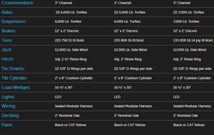 Capacity:10,000 Lbs.12,000, Lbs.14,000 Lbs.. Overall Width:98” / 102”, Optional 98” / 102”, Optional 98” / 102” Optional. Deck Length:14’ – 20’, Flat14’ – 20’, Flat14’ – 20’ Flat. Main Frame:6”, 6”, 6”. Tilt Deck Frame:Formed, Formed, Formed