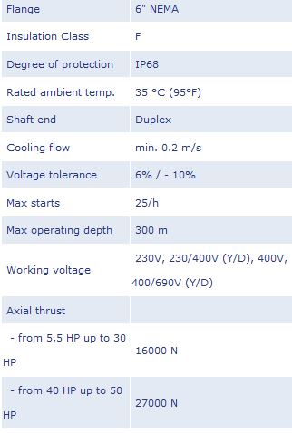 Submersible motor 6” GX seriesof water filled submersible motors with encapsulated (canned) stator completely built in AISI 316 for aggressive/salty water. The motor is supplied pre-filled with a coolant (entirely non-toxic) consisting of a water + propylene glycol mixture with anti-oxidant, lubricating and anti-freeze functions (up to -15 °C). The thrust bearing unit and the radial bearings are lubricated by the liquid inside while a membrane ensures variation of the liquid volume as well as pressure compensation. The electric power cable is connected to the motor by means of a watertight removable connector. A mechanical seal in SIC/SIC together with a special sand-guard ensures operation also in the presence of sandy waters; a temperature sensor can be fitted as optional.
