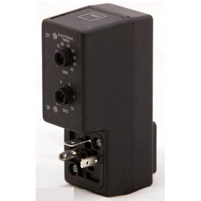 Upon application of power the timer resets, enters the ON state for a period T1, then switches OFF for a period T2. This cycle repeats until power is removed. These timers are compatible with Powerflow Solenoid Valves. The timers can be sold separately or as a complete assembly.