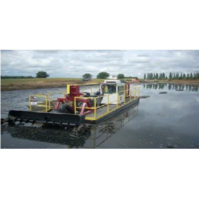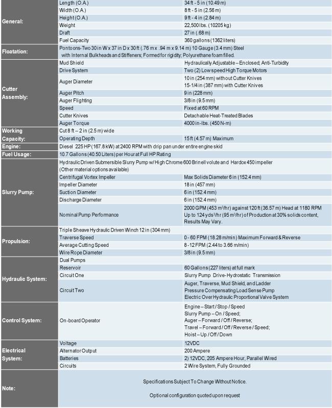 The man-operated Mud Cat727 features a 225 HP diesel-powered power unit and a hydrostatic high-pressure circuit to drive a submersible pump equipped with a centrifugal vortex style impeller passing 6-inch solids. Principal features include fingertip controls for travel and pump speed, a shrouded horizontal auger