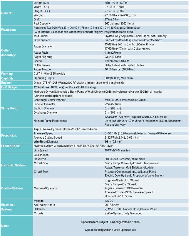 The man-operated Mud Cat 745 features a 275 HP diesel-powered power unit and a hydrostatic high-pressure circuit to drive a submersible pump with a nominal performance of 3200 GPM at 100 feet of head pressure with an 8-inch solids handling capacity. Principal features include an operation depth of 30 feet, a high-torque single motor horizontal cutter assembly, centrifugal vortex style impeller, a triple sheaved traverse winch, and a hydraulic-powered cable winch elevation system for the cutter assembly. The Mud Cat 745’s flotation system is comprised of baffled 10 gauge steel pontoons filled with two-pound density foam and matched with a heavy-duty structural steel frame coated with epoxy paint. A comfortable heated and air conditioned operator cab includes fingertip controls for travel and pump speed.