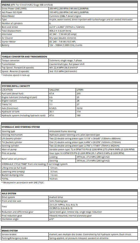 Bucket Capacity 4.2-4.7 yd3 | Operating Weight 38,540 lbs | Cummins Engine/Output 193 HP | Breakout Force 32,370 lbs.