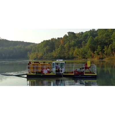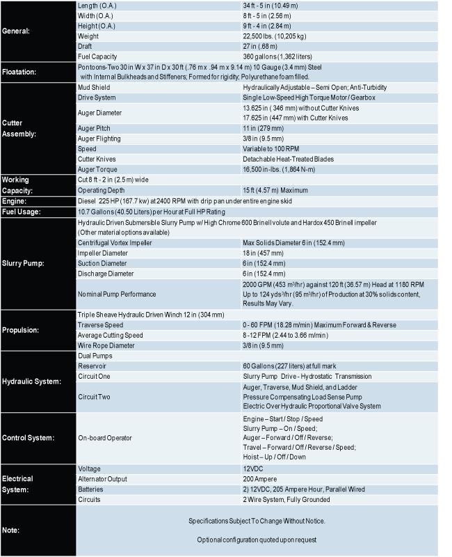 The man-operated Mud CatT 815 features a 225 HP diesel-powered power unit and a hydrostatic high-pressure circuit to drive a submersible pump equipped with a centrifugal vortex style impeller passing 6-inch solids. Principal features include a high-torque single motor horizontal cutter assembly, a triple sheaved traverse winch, and a cylinder controlled elevation linkage for the cutter assembly. The Mud Cat 815’s flotation system is comprised of baffled 10 gauge steel pontoons filled with two-pound density foam and matched with a heavy-duty structural steel frame coated with epoxy paint. A comfortable heated and air conditioned operator cab includes fingertip controls for travel and pump speed.