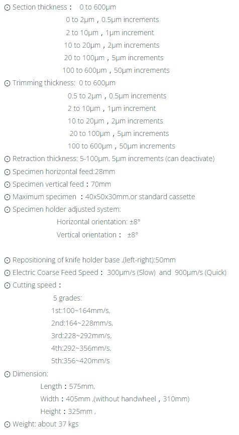 The casing of microtome is amde from fire-retsrdant ABS palstic with streamlined design . Spacious and ingenious waste tray. Advanced retraction function makes better sectioning. The retraction value is also adjustable . Universal and fast specimen holders fits international embedding cassettes. Handwheel locking may be activated at any position and improve operation safety standard . The electric coarse feed operates two speeds which is easy to record the feed. Separated control panel is much easier to operate. Three motorized sectioning modes (Cont, Single and Step) are available for user to select. Automatic memorized coarse feed and reload function can significantly improve cutting efficiency.