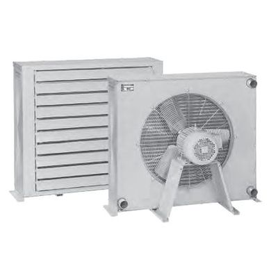 Industrial air-cooled liquid coolers with hydraulic fan drive, high performance six row rolled tube heat exchangers with direct electric drive cooling fan, OSHA guard, and air directing louvers. Rated operating temperature of 300oF at 300 PSIG. Services standard flow rates from 4 to 250 GPM. Thermal capacity up to 210 hp (157Kw). NPT, flange, or SAE straight thread port connections. Optional built-in bypass relief valve 30 PSI or 65 PSI. Can be modified to meet your requirements. Suitable for most hydraulic oils, lubrications oils, synthetic compressor oils, ethylene glycol, and many other fluids compatible with listed material.