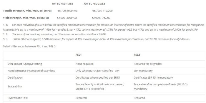 The American Petroleum Institute specification API 5L covers seamless and welded steel line pipe. This is steel pipe for pipeline transportation systems in the petroleum and natural gas industries. API 5L is suitable for conveying gas, water, and oil. Size range is limited only by manufacturer’s capabilities. Specifications for API 5L adhere to the International Organization for Standardization ISO 3183, which standardizes pipeline transportation systems within the materials, equipment and offshore structures for petroleum, petrochemical, and natural gas industries. The technical committee authoring the standards recognized that there are two basic Product Specifications Levels (PSL) of technical requirements and therefore developed PSL 1 and PSL 2. PSL 1 is a standard quality for line pipe where PSL 2 contains additional chemical, mechanical properties, and testing requirements.