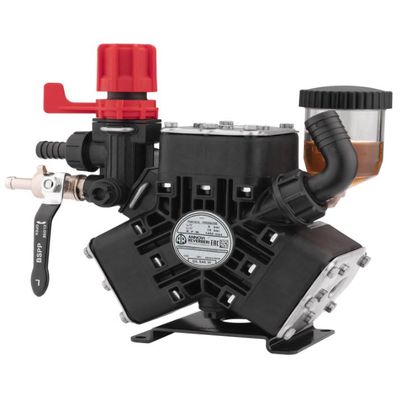 Three-diaphragm pump with reinforced Polypropylene circuit, Kynar/AISI 316 valves (LFP version), AISI 316 diaphragm mounting components, Viton seals. Version: SP (cylindrical with shaft key), CR (reduction gearbox for internal combustion engine), EL (direct coupling to electric motor). Integral or remote Polypropylene pressure regulator with bypassing release lever.