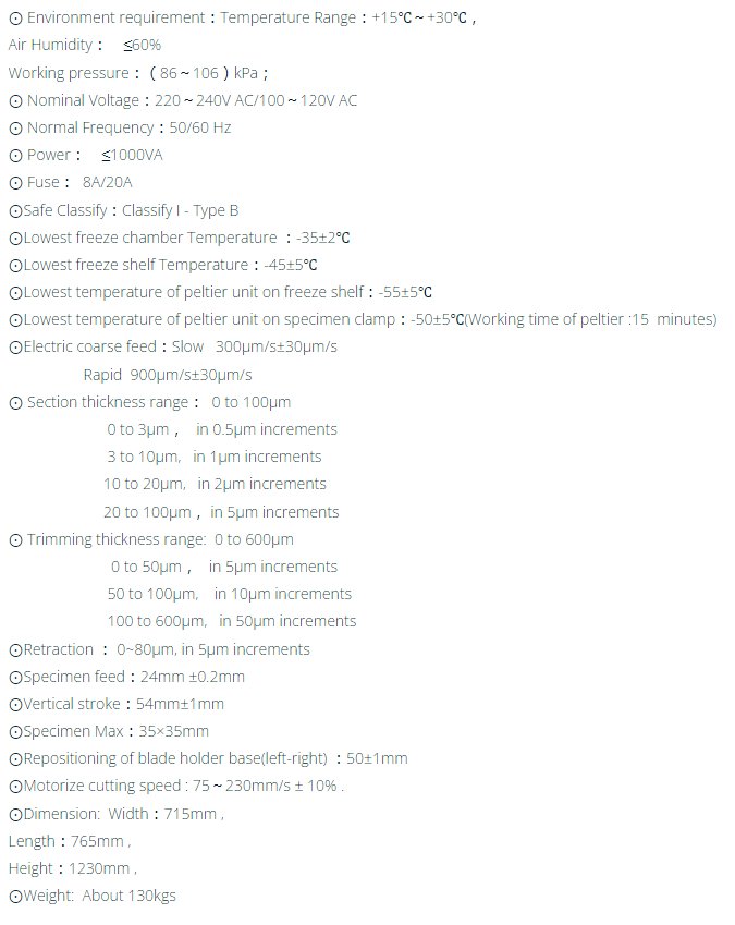 It is designed under overall engineering and ergonomic concept. All the components are processed by computer numerical controlled machine. Retraction function prevents specimen damage from blade. Total thickness calculation. The low temperature refrigeration system with environment friendly refrigerant R404. Adopt UV sterilize for 30 minutes every time. Peltier specimen clamp refrigeration can be turn On or Off manually. Two defrosting methods: manual and automatic. The high prevision unit is enclosed outside the cryostat chamber to prevent it from thermal expansion and contraction, and keeps minimum maintenance requirement. Artificial intelligent interface is easy to learn and operate. Touch Screen and display all information including thickness, thickness sum, controlling time, temperature, time on/off and so on.