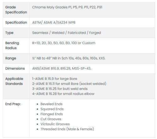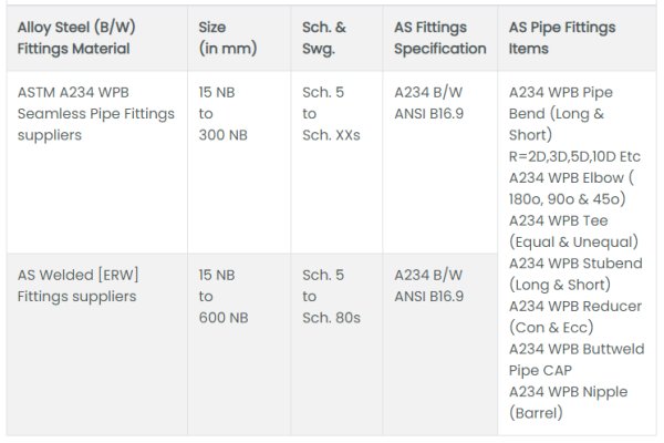 Vishal Steel (India) is a manufacturer, exporter & suppliers of ASTM A234 WPB Fittings, Chrome-Molybdenum ASTM A234 WPB Fittings for the petrochemical, nuclear, gas and oil industries, Norsok Ed4, BP, Saudi Aramco, SABIC and Shell approved, producing ASTM A234 WPB alloy steel butt welding pipe fittings, ASTM A234 Chrome Moly Grade WPB Fittings in accordance to ASME B16.9. Vishal Steel India offers a widest range of ASTM A234 WPB buttweld pipe fittings such as ASTM A234 WPB Reducer, ASTM A234 WPB Elbow, ASTM A234 WPB Tee, ASTM A234 WPB Cross, ASTM A234 WPB Stub Ends and ASTM A234 WPB Piggable Bends. ASTM A234 is the standard specification for pipe fittings of wrought carbon steel and alloy steel for moderate and high-temperature service. The Cr-Mo low alloy steel pipe fittings has been separately listed on our website. Carbon steel pipe fittings manufactured to ASMT A234 are usually furnished in butt-welding form in accordance with ASME B16.9