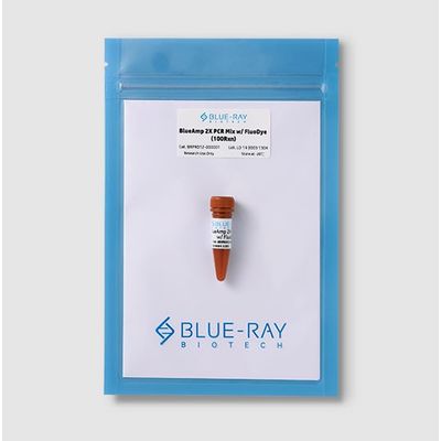 BlueAmp 2X PCR Mix w/ FluoDye is a pre-mixed solution containing Taq DNA polymerase, PCR buffer, dNTP, gel loading dyes, enhancer, and fluorescence dye. The mixture contains the gel loading dye which allows user loading to gel for electrophoresis right after the PCR. Moreover, after electrophoresis, the gel is ready for detection on LED or UV illuminator since the mixture contains fluorescent dye. BlueAmp 2X PCR Mix w/ FluoDye streamlines the complicated workflow of PCR and staining gels. BlueAmp 2X PCR Mix w/ FluoDye is suitable for routine gene screening researchers. It takes only one step from PCR to gel illumination.