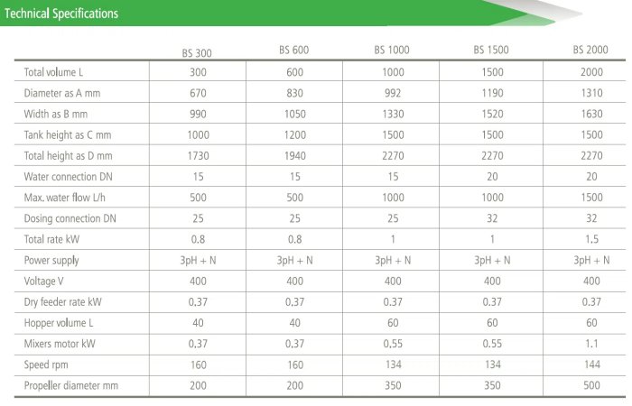 BS models are complete systems to dilute powder chemicals with water in batch mode if dosing with standard dry feeder and compatible with HDPE and stainless steel, in adjustable variable concentrations ratio 1:5. Built as skid principles where all components are connected and tested make it easy electrical and hydraulic installation saving time and money. Easy maintenance and operation procedures make them ideal systems used to prepare carbon and lime suspensions, soda ash or even polyelectrolyte solutions that require batch preparation process.