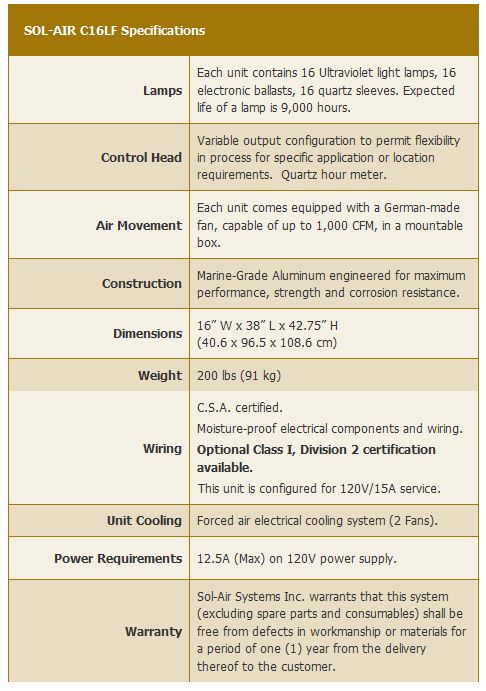 The Sol-Air C16LF is suited for small to medium industrial applications, such as wastewater lift stations, small wastewater treatment plants or larger commercial businesses. All Sol-Air Industrial units are engineered to provide versatility in variable seasonal or contaminant load conditions. Depending on the size and scope of the project, this unit can be used stand alone and/or in conjunction with additional Sol-Air Industrial units.