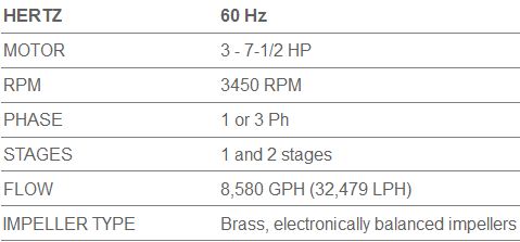 Rugged pumps built for extra performance. Nationally known NEMA JM motors. Nationwide service available from authorized service stations. Brass impellers are electronically balanced. Capacities up to 8,580 GPH (32,479 LPH). Pressures to 85 PSI. 3` (7.6 cm) suction.