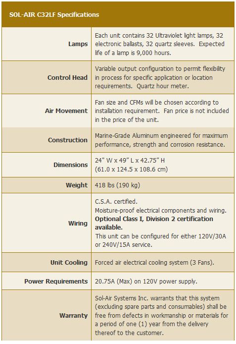 The Sol-Air C32LF is built to handle projects dealing with high volume and concentration contaminants, such as large wastewater plants, petroleum industry applications and large scal agriculture businesses. Units can be combined in series to provide solutions for any size of application.