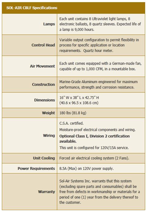 The Sol-Air C8LF is suited for small to medium industrial applications, such as wastewater lift stations, small wastewater treatment plants or larger commercial businesses. All Sol-Air Industrial units are engineered to provide versatility in variable seasonal or contaminant load conditions. Depending on the size and scope of the project, this unit can be used stand alone and/or in conjunction with additional Sol-Air Industrial units.