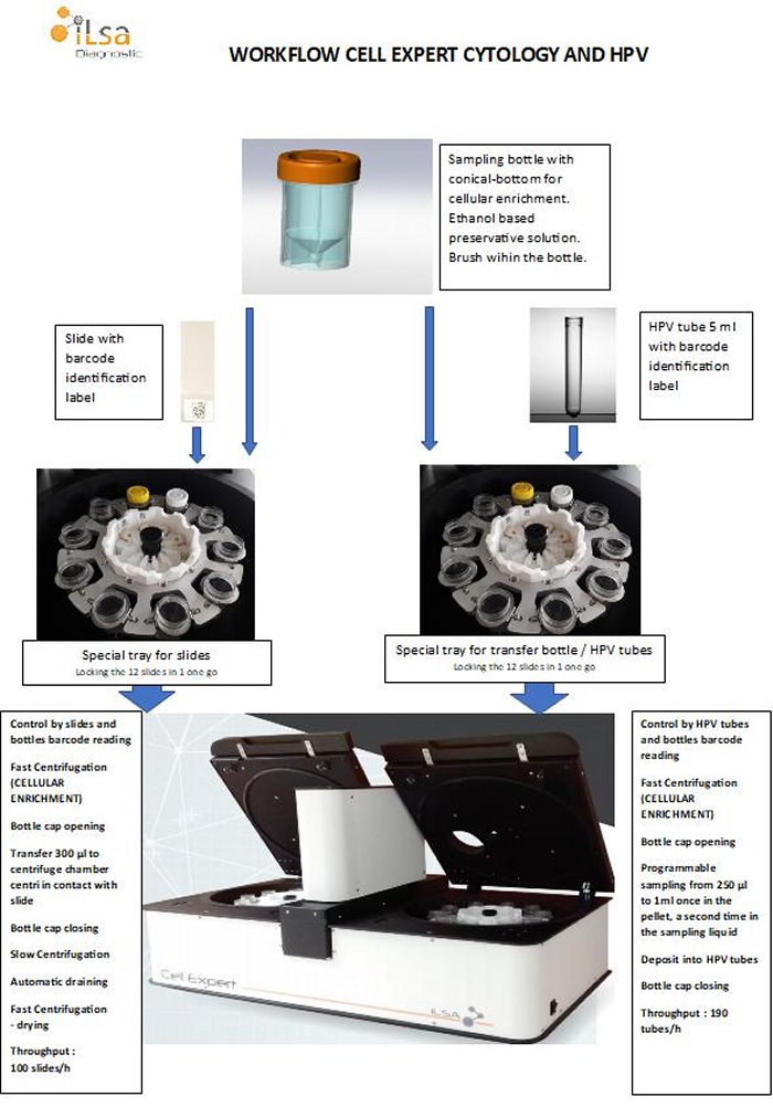 Cell Expert is a high-speed automat with opening and closing of the bottles. But Cell Expert has many other very competitive advantages: Brush in the bottle : 100% of collected cells are sent to the laboratory, Possibility of spreading several slides for the same sample. A secure process : Zero risk of contamination due to the use of disposable tips. Any operating error is detected and flagged up, slides and specimen bottles are identified with same barcodes, barcodes are read before picking and dispensing, software meets standard 62304 requirements. Identical concentration of cells with the integrated centrifugation of the sample bottles and then dilution. Small size of GYN specimen bottle (diameter under 30 mm) for posting, Non toxic preservative liquid (without methanol and without formol) Ergonomic instrument for quick and easy handling (training of 2 hours maximum) High throughput 100 slides /hour with automatic cap opening