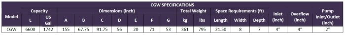 The CGW is the most widely used greywater systems in the Greyter commercial line. Because of its versatility, the CGW is used in many different applications ranging from military camps to vacation resorts, hotels, schools and every fit in between. The holding capacity of a standard CGW is ~ 6600 litres (1750 gallons), which could recycle enough greywater per day to fully service the flush volume requirements in a 160Bman labour camp or a wind of a detention centre.