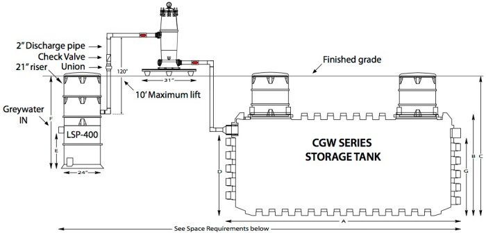 The Greyter CGW Commercial System is a complete allBinBone greywater recycling system which includes a lift station, above grade dual pressure filters, a managed chlorination system with a dedicated pump, a variable frequency, 5hp constant pressure greywater pumping system, pressure filter alarms, and a integrated building management system.