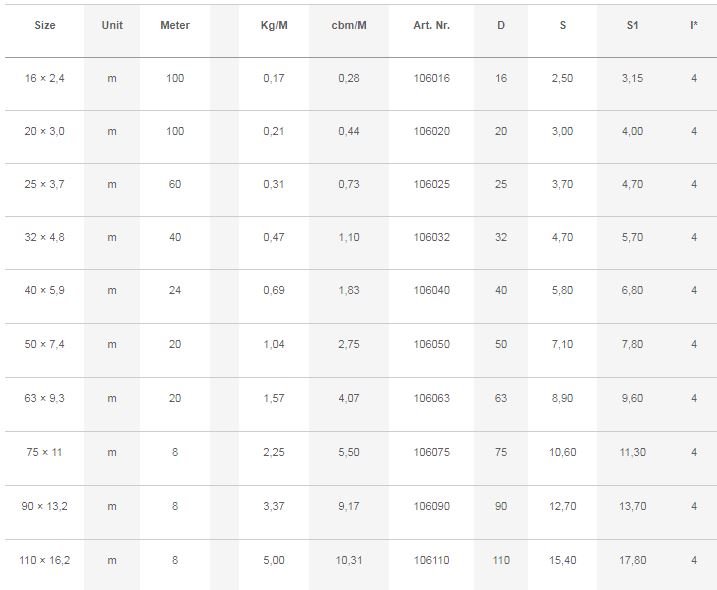 A 4-m pipe suitable for hot water distribution systems in lower ceilings, heating and cooling water distribution systems in hot-water heating systems or air-conditioning systems and wherever the pipe“s low thermal expansion and high stiffness will be great. When installing the pipe, there is no need to use any supporting gutters. Available in Gray and Green colors. Standards: DIN 16962, EN ISO 15874.