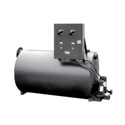 A Cylindrical Steel Condensate unit for holding a large volume of water and pumping water temperatures up 200°F (with Model D pump) and temperatures up to 210°F (with Model P pump). A standard black steel receiver is built with flat heads and thickness ranging from 3/16" to 3/8" for years of service; an option for heavier thickness is available. Receiver also can be 300 series stainless steel for maximum corrosion resistance; most receiver sizes can be epoxy-lined or plasite-lined. Units are floor-mounted for low-piped gravity returns and with tank sizes ranging from 70 gallons to 1488 gallons; custom-sized tanks can be made for unique applications. Unit can handle a wide range of flows and pressures. Units are available in either simplex or duplex configurations with a variety of options including gauge glass, thermometer, control panel; motors can be either 1750 RPM or 3500 RPM, single or three phase. Unit equipped with bronze-fitted Model D or Model P pumps typically fitted with industry standard motors and with mechanical seals rated for temperatures up to 250°F. Higher temperature seals and special faces available upon request.